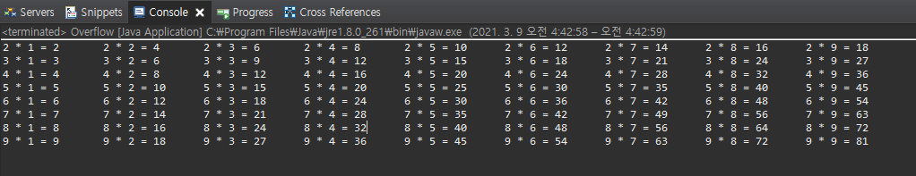 복습중에 구구단 출력 예제의 대명사 중첩for문을 사용치않고 구구단 출력을 해보자싶어 남겨봅니다