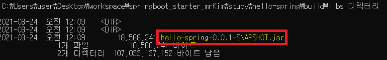 cmd에서 build 하여 hello-spring-0.0.1-SNAPSHOT.jar 가 생성됨.