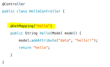 return "hello" >> spring 에서는 view파일명을 의미했고 springboot에서도 마찬가지,