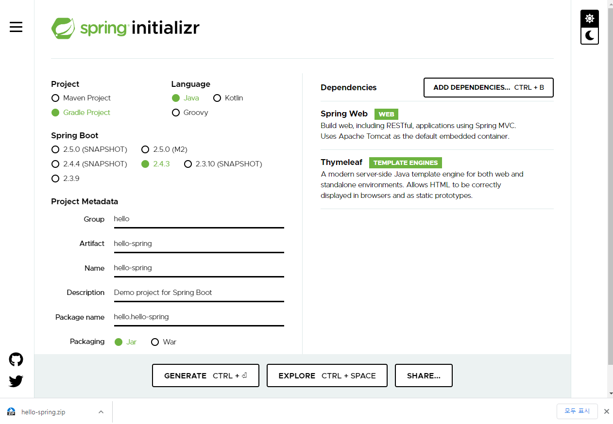 그리고 dependencies로 프로젝트에 필요한 라이브러리를 추가하고 generate를 누르면 압축파일이 다운로드된다