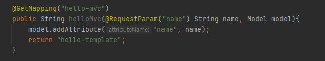 지난번엔 model에 직접값을 입력했지만, 이번엔 클라이언트로부터 파라미터(name)을 받아 model에 담아주었다.