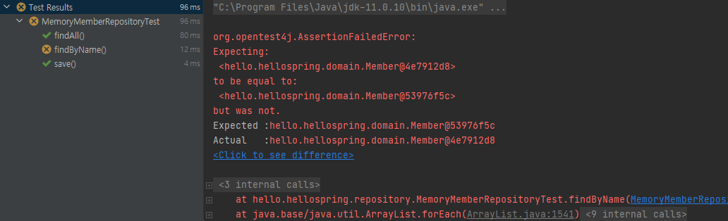 테스트코드는 각 메소드별로 실행할 수도 있고 클래스 전체로 실행할수도 있다.