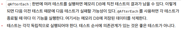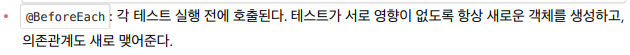 그리고 각 메소드마다 @Test 어노테이션으로 테스트코드임을 알려주고 내가 작성한 코드가 정상적으로 돌아가는지 확인하는 코드를 작성한다. (로직을 충분히 이해해야되고 발생할수 있는 오류를 최대한 확인할수 있게 작성한다) 따라서 테스트코드 작성자가 예상하지 못한 에러는 테스트코드 작성으로 확인할수 없다는 단점이 있지만, 매번 프로그램 실행을 통한 오류확인(파라미터값이 필요한 경우 파라미터값 전달 등등 수동으로 진행)하는 것보다는 편리하다는 장점이 있다.