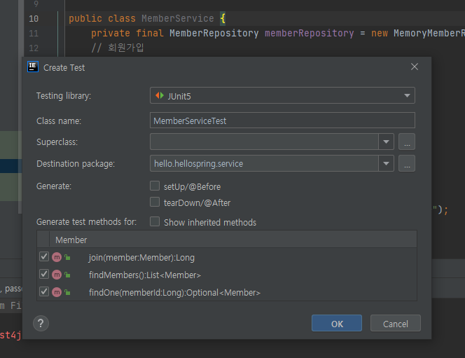 작성한 service 클래스의 테스트코드 생성하기 (단축키 ctrl + shift + t / 오른쪽마우스버튼 > go to > test > create test )