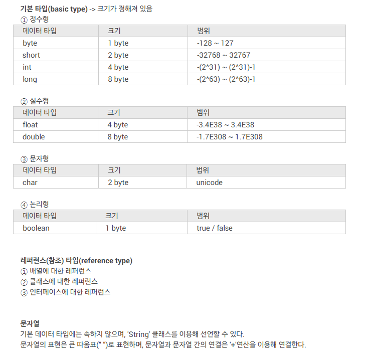 변수의 데이터타입은 기본형(순수 값)과 참조형(객체의 주소)으로 구분되어지며, 참조형은 객체(클래스, 배열, 인터페이스, 맵 등)를 의미한다고 보면된다.