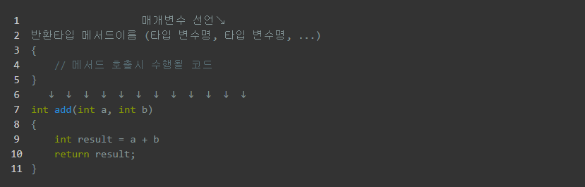 1. 매개변수 선언 : 메소드 수행시 필요한 값들을 제공받기 위한 것이며,