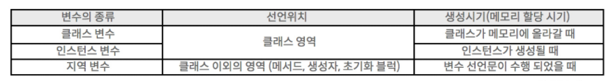 필드 중 static이 붙은 것은 클래스 변수, 붙지 않은 것은 인스턴스 변수이다.