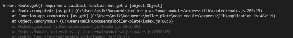 에러메시지는 router.get에서는 콜백함수를 받아와야 하는데 객체를 받아와서 에러가 뜬다고 알려주는겁니다.