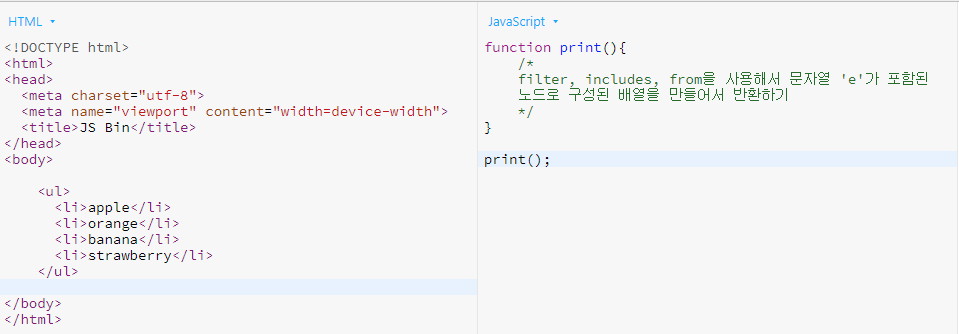 filter, includes, from을 사용해서 문자열 'e'가 포함된 노드로 구성된 배열을 만들어서 반환하기
