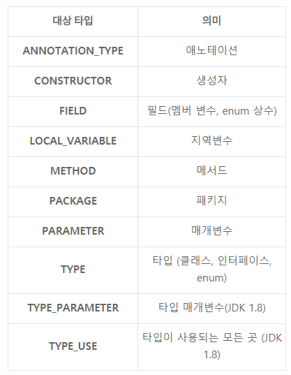 * ANNOTATION_TYPE은 애노테이션을 선언할 때 붙일 수 있다는 뜻이며