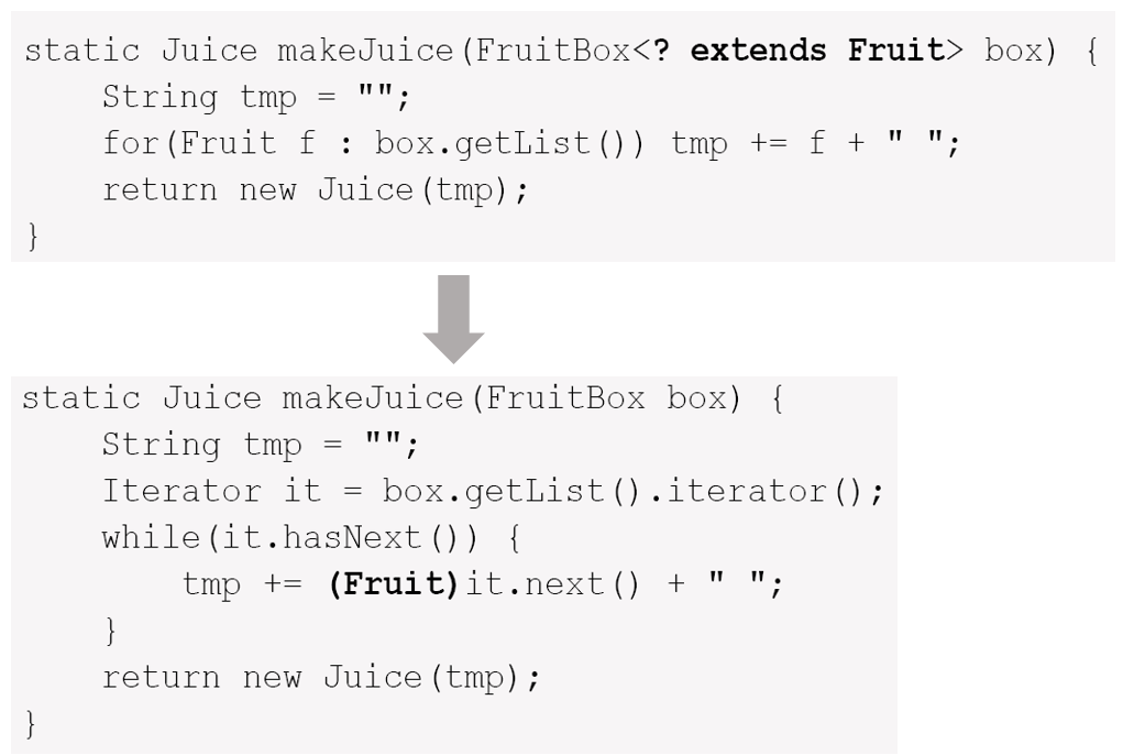 ③ 와일드 카드가 포함되어 있는 경우에는 적절한 타입으로의 형 변환이 추가된다.