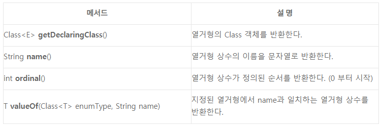 static E valueOf(String name) : 전달된 문자열과 일치하는 해당 열거형의 상수를 반환한다.