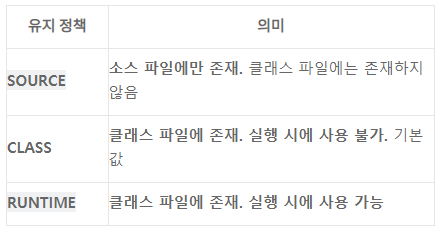 - @Retention은 애노테이션이 유지(retention)되는 기간을 지정하는데 사용된다.