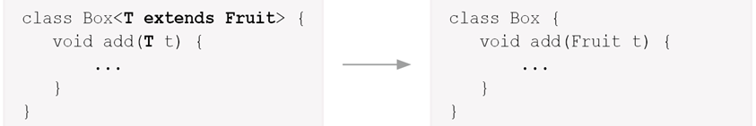 - 컴파일러는 제네릭 타입을 제거하고, 필요한 곳에 형 변환을 넣는다.