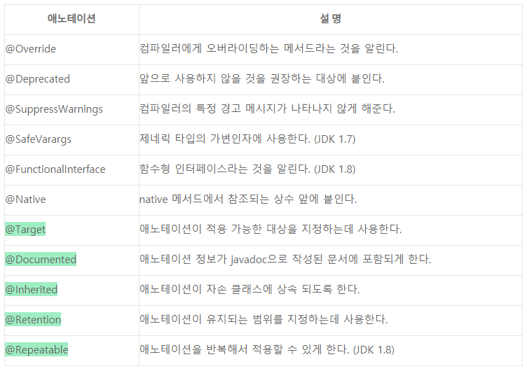위의 표에서 초록 바탕의 애노테이션은 "메타 애노테이션"이다.