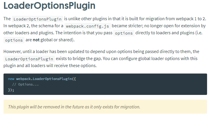 LoaderOptionsPlugin이 웹팩 2에서 2로 웹팩 1에서 마이그레이션을 위해 사용된다.