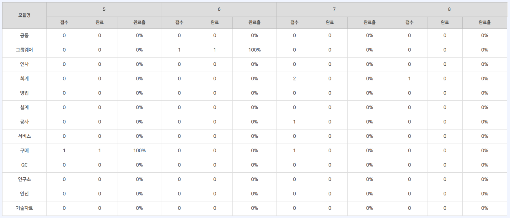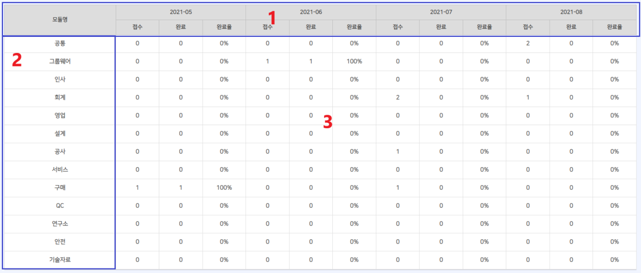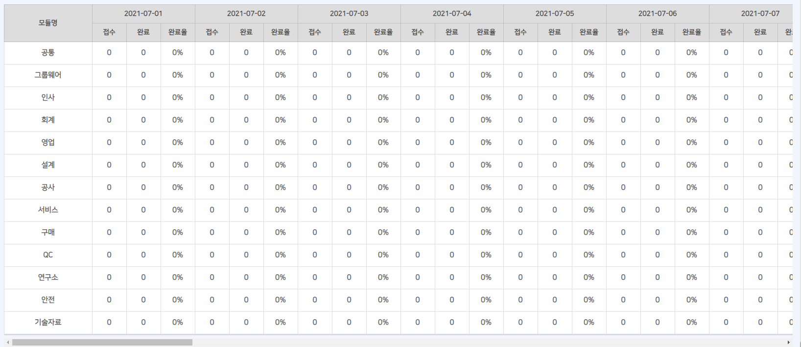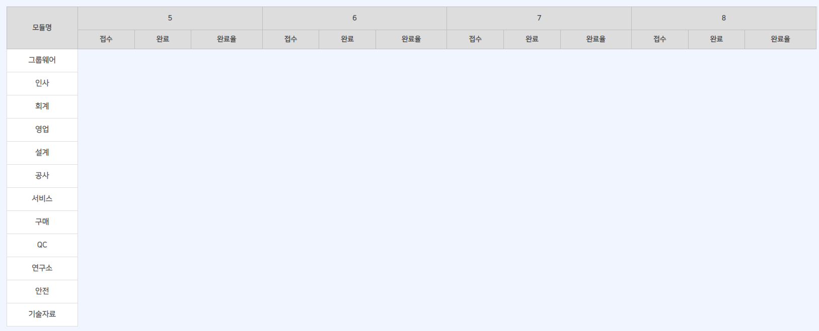 - 조회조건이 회사, 기간이었기 때문에 해당 table은 thead부분과 모듈명이 조건에 따라 다르게 적용된다.