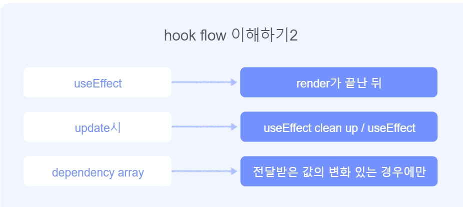 - 해당 컴포넌트의 변화(update)시 useEffect clean up이 먼저 실행되고 useEffect가 실행된다.
