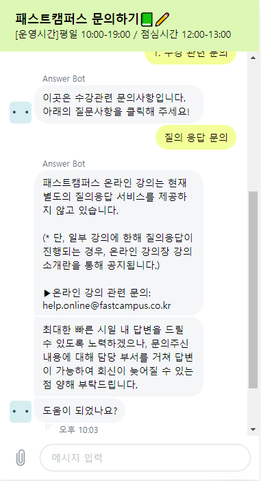 인프런과 패스트캠퍼스 둘다 이용해본 입장으로 인프런에서 제공하는 질의응답 서비스는 벤치마킹할 필요가 있다고 생각한다.