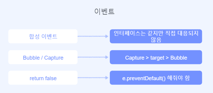 모든 브라우저에서 동일하게 동작하지만 브라우저의 고유 이벤트와 동작이 일치하지 않기 때문에,