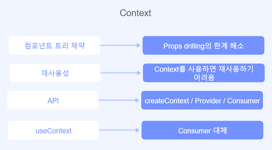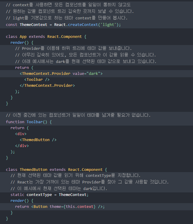 - context를 이용하면 props drilling을 거치지 않고도 컴포넌트 트리 전체에 데이터를 제공할 수 있다.