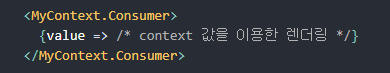 Context.Consumer 컴포넌트의 자식은 함수여야하며, 이 함수는 context의 현재값을 받고 React 노드를 반환한다.