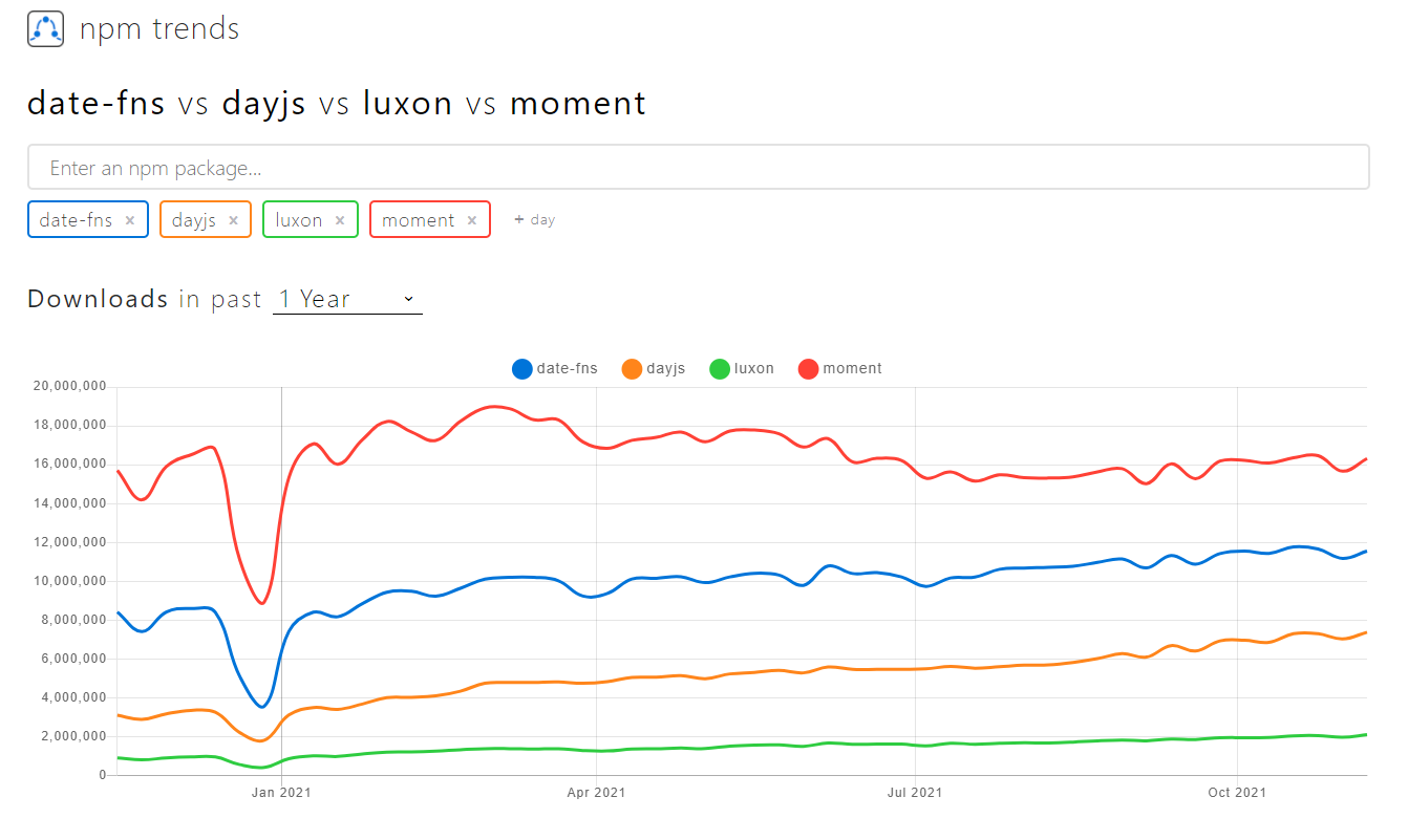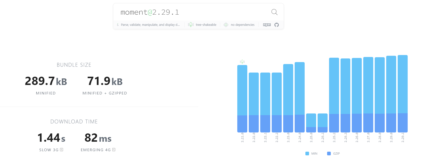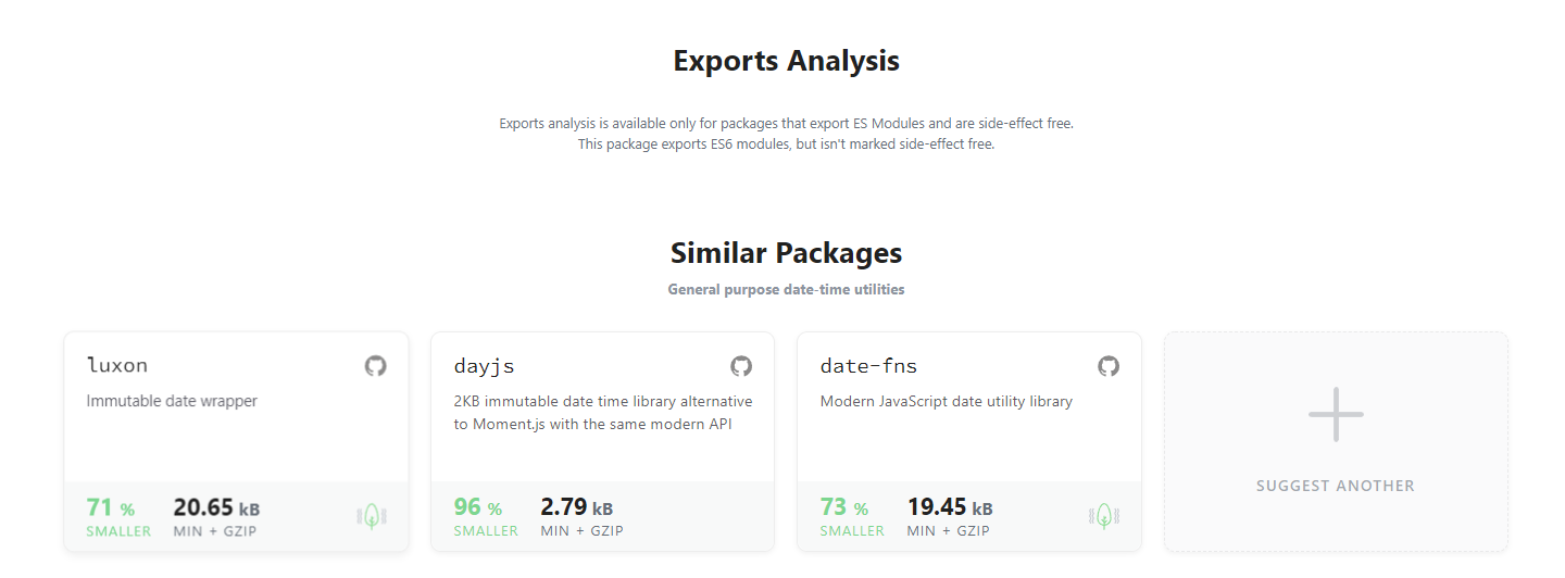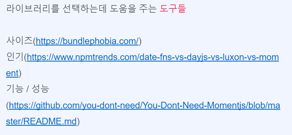 moment.js 를 검색했더니 번들 사이즈가 289.7KB 이고, 비슷한 패키지로 LUXON, dayjs, date-fns 가 나왔다.