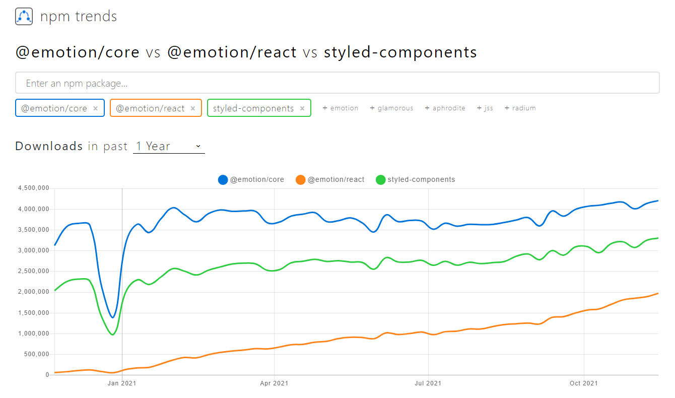 npm trends로 비교해보아도 emotion이 우세한 것으로 확인된다.